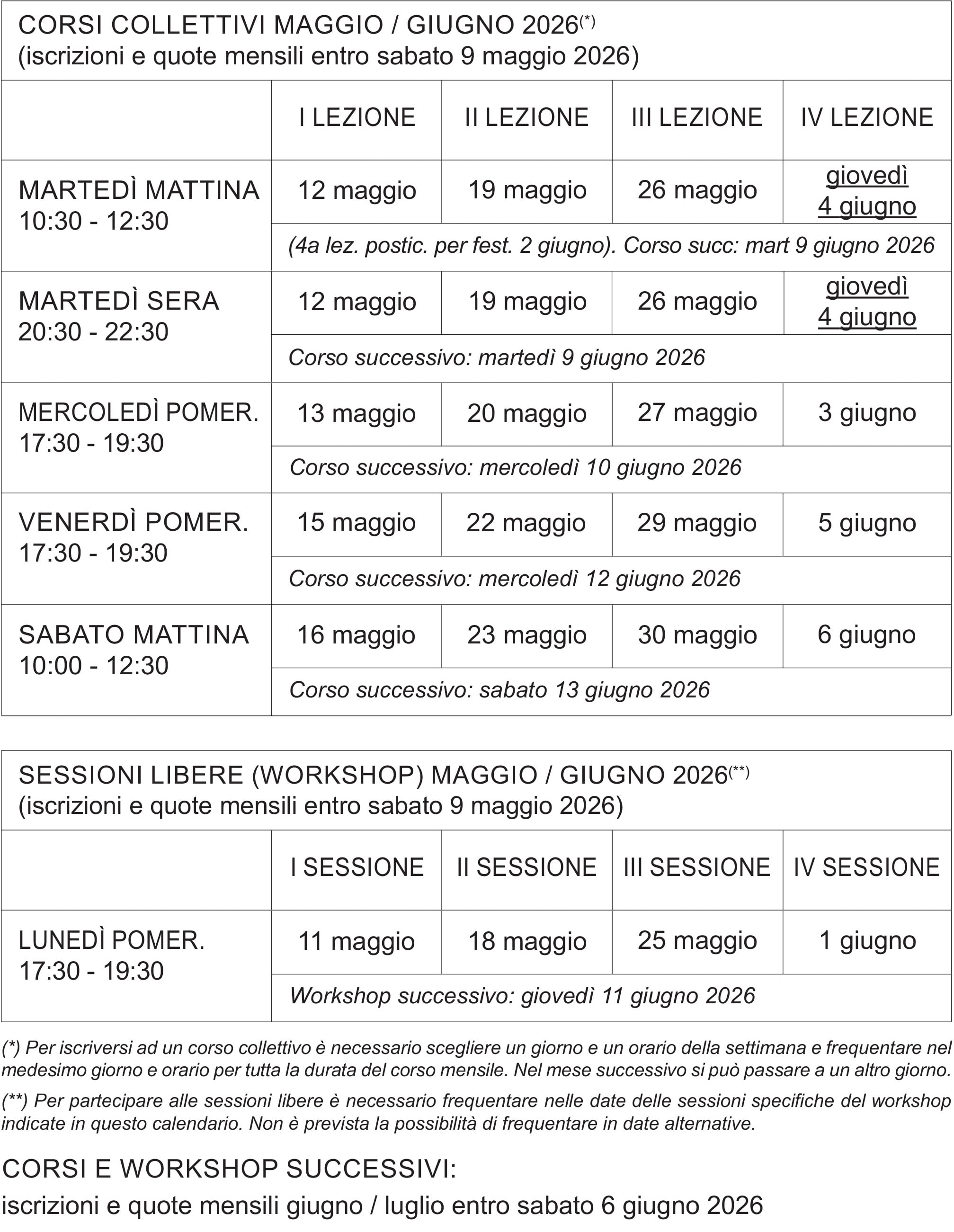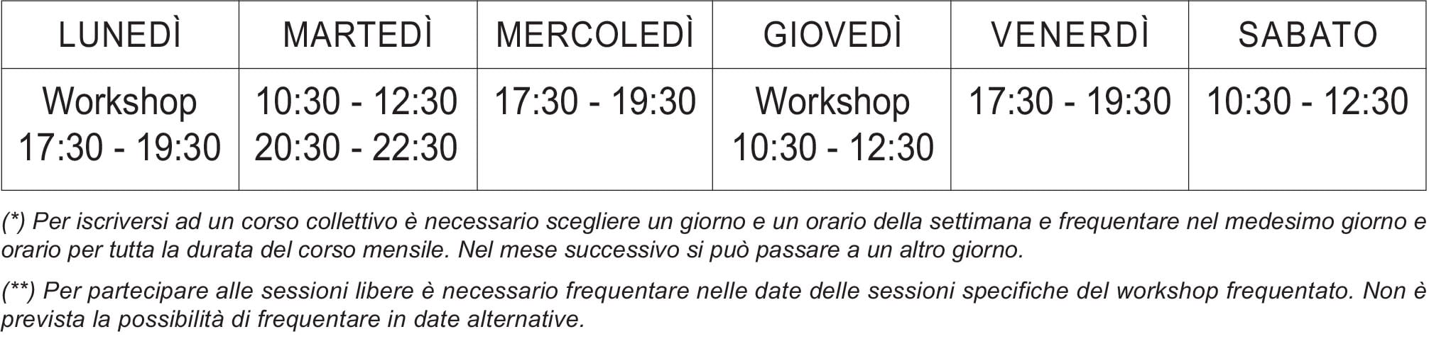 Orari corsi collettivi e workshop