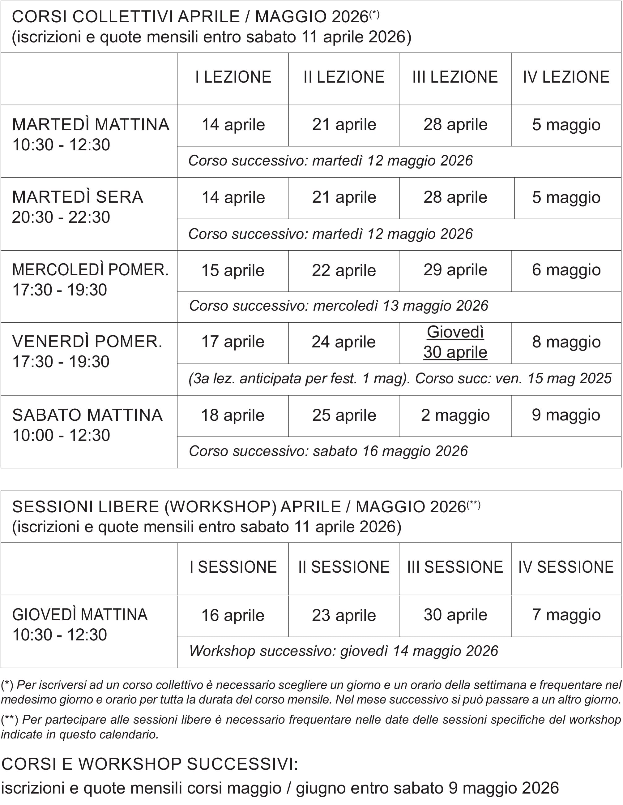 Calendario corsi collettivi e workshop